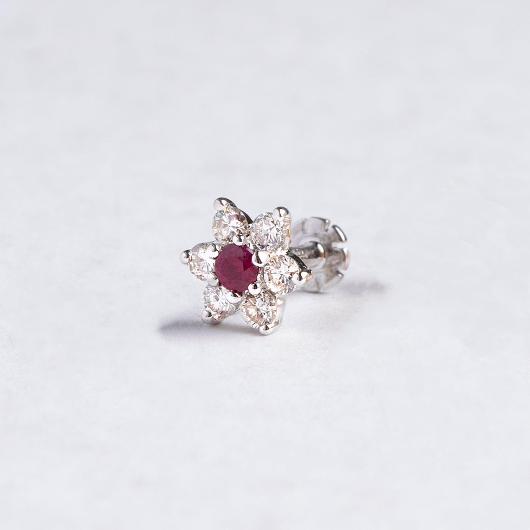 Neuspiercing met schroefdeksel, gemaakt van 18-karaats goud met een cluster van diamanten en robijnen.