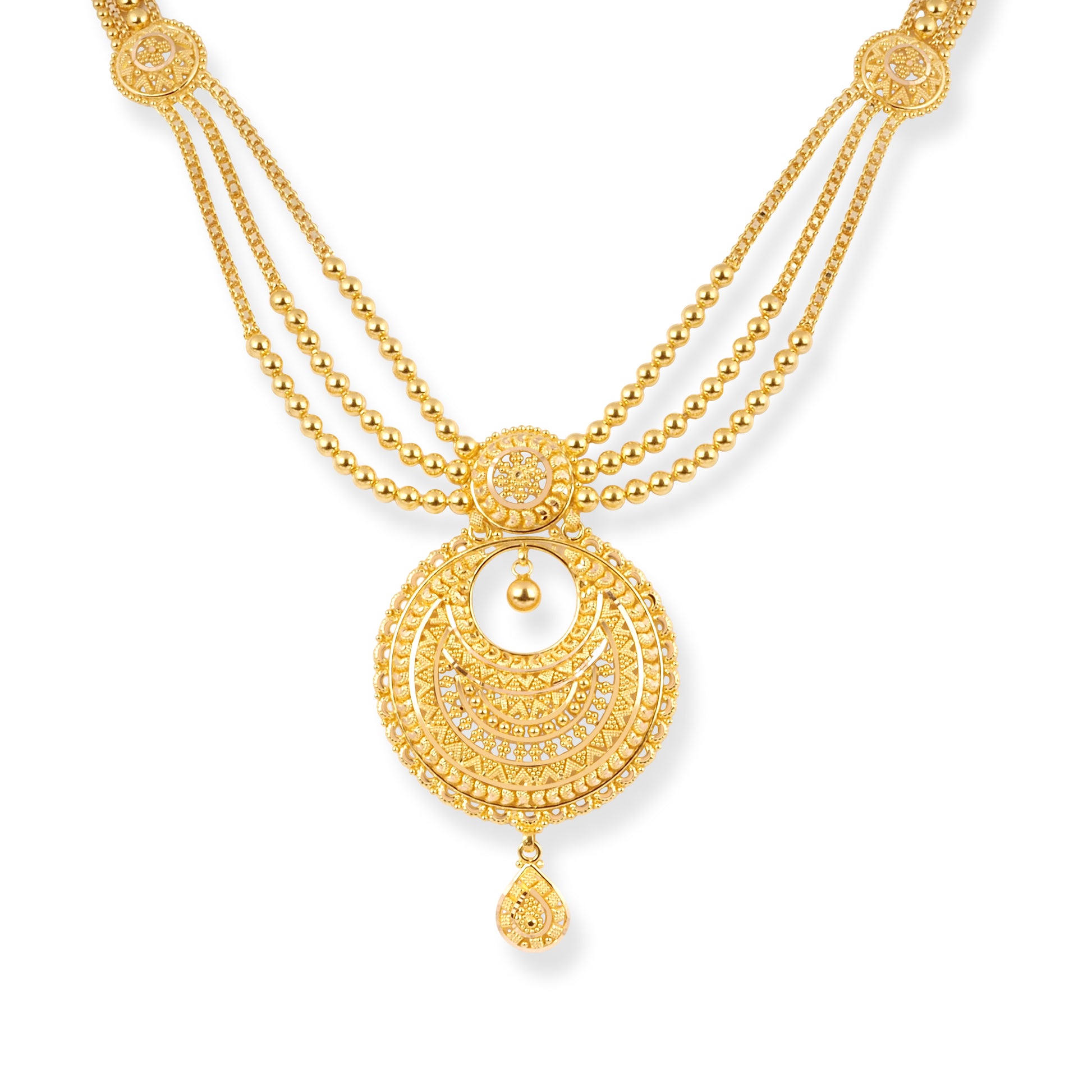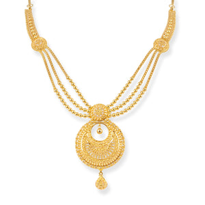 Make a bold and timeless statement with this exquisite 22ct Yellow Gold Traditional Three Row Necklace with Filigree Drop Design, crafted to showcase the beauty of classic craftsmanship. Designed with three elegant rows of gold beads and fine chains, this necklace creates a layered look that adds depth and richness to any outfit.