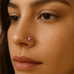 Dieser Nasenstecker aus 18 Karat Gold mit Diamanten und Amethyst-Clustern ist der Inbegriff von raffiniertem Luxus. Dieses atemberaubende Schmuckstück wurde sorgfältig gefertigt und verleiht jedem Ensemble einen Hauch von Glamour und Eleganz. Die funkelnden Diamanten und der exquisite Amethyst bilden eine atemberaubende Kombination, die das Licht wunderschön einfängt.