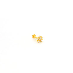 This elegant 18ct yellow gold nose stud features a charming star floral design set with sparkling cubic zirconia stones. The defined gold petals surrounding each stone create a compact flower shape that offers both brilliance and detail in a delicate size.