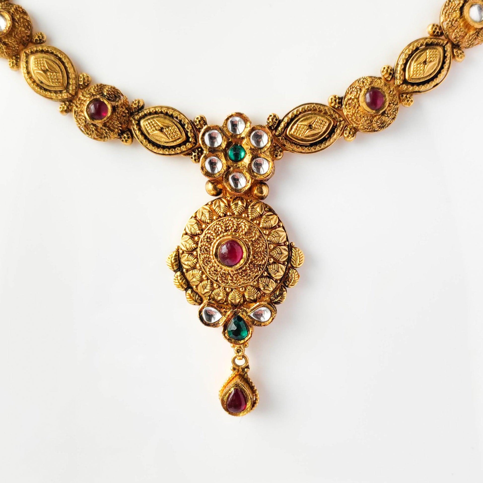 22ct Gold Antiquated Look Necklace set with Green, Red and White Polki Style Cubic Zirconia Stones (48.3g) N&E-8205 - Minar Jewellers