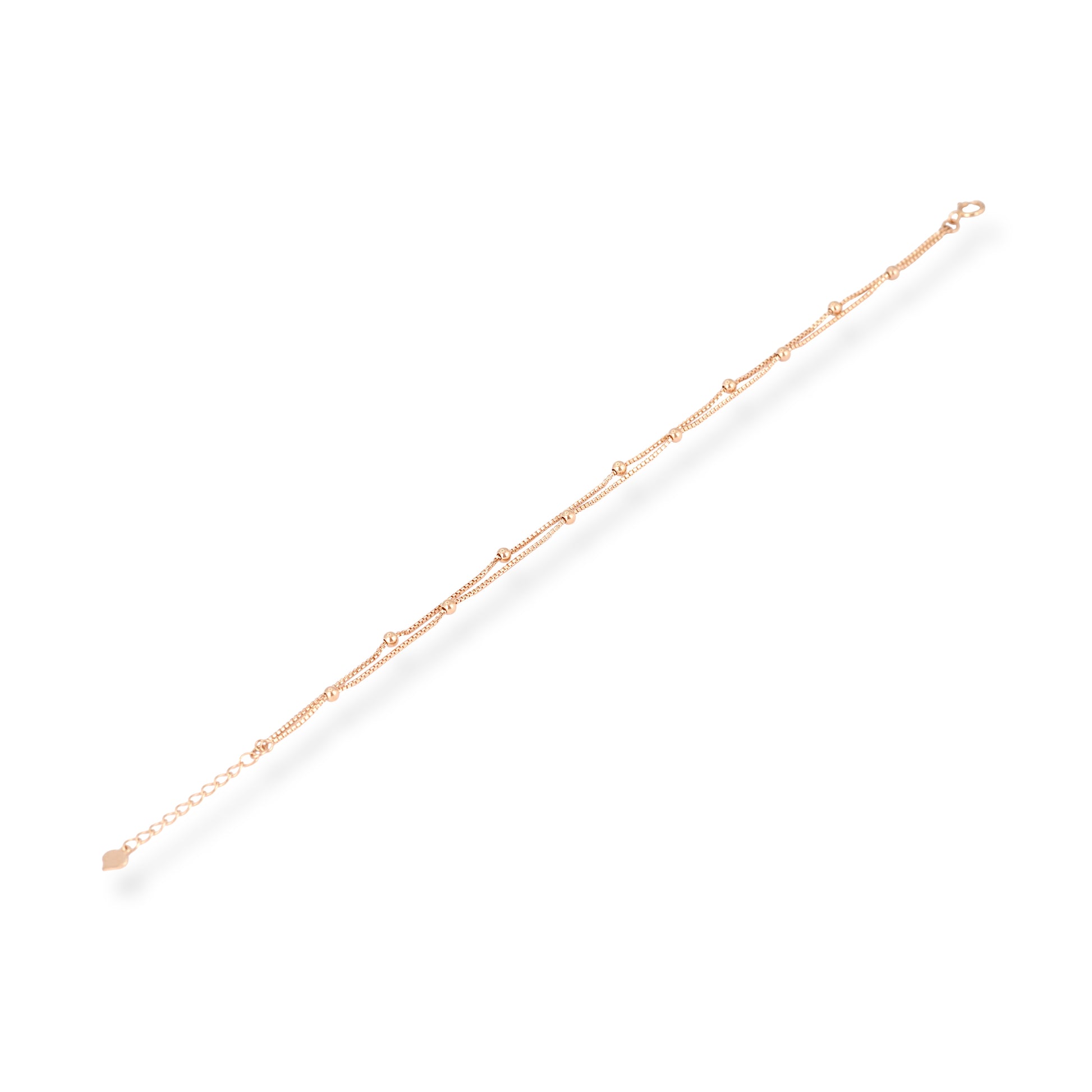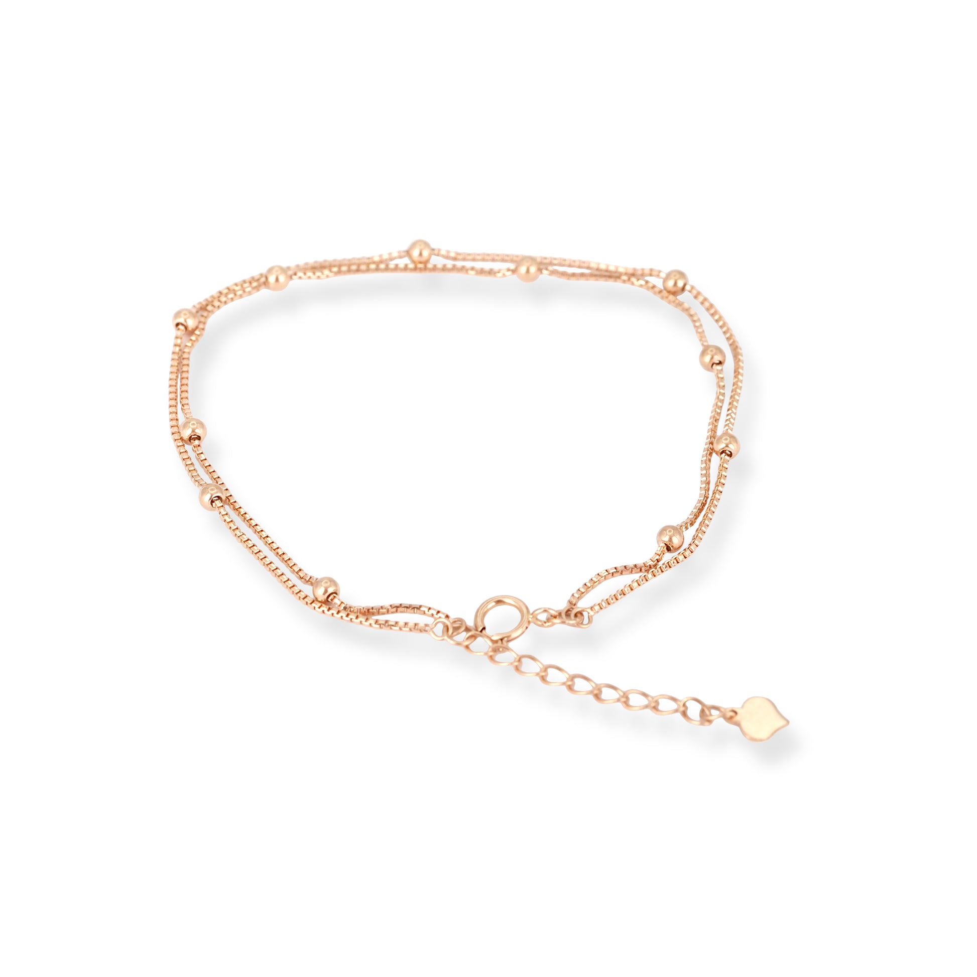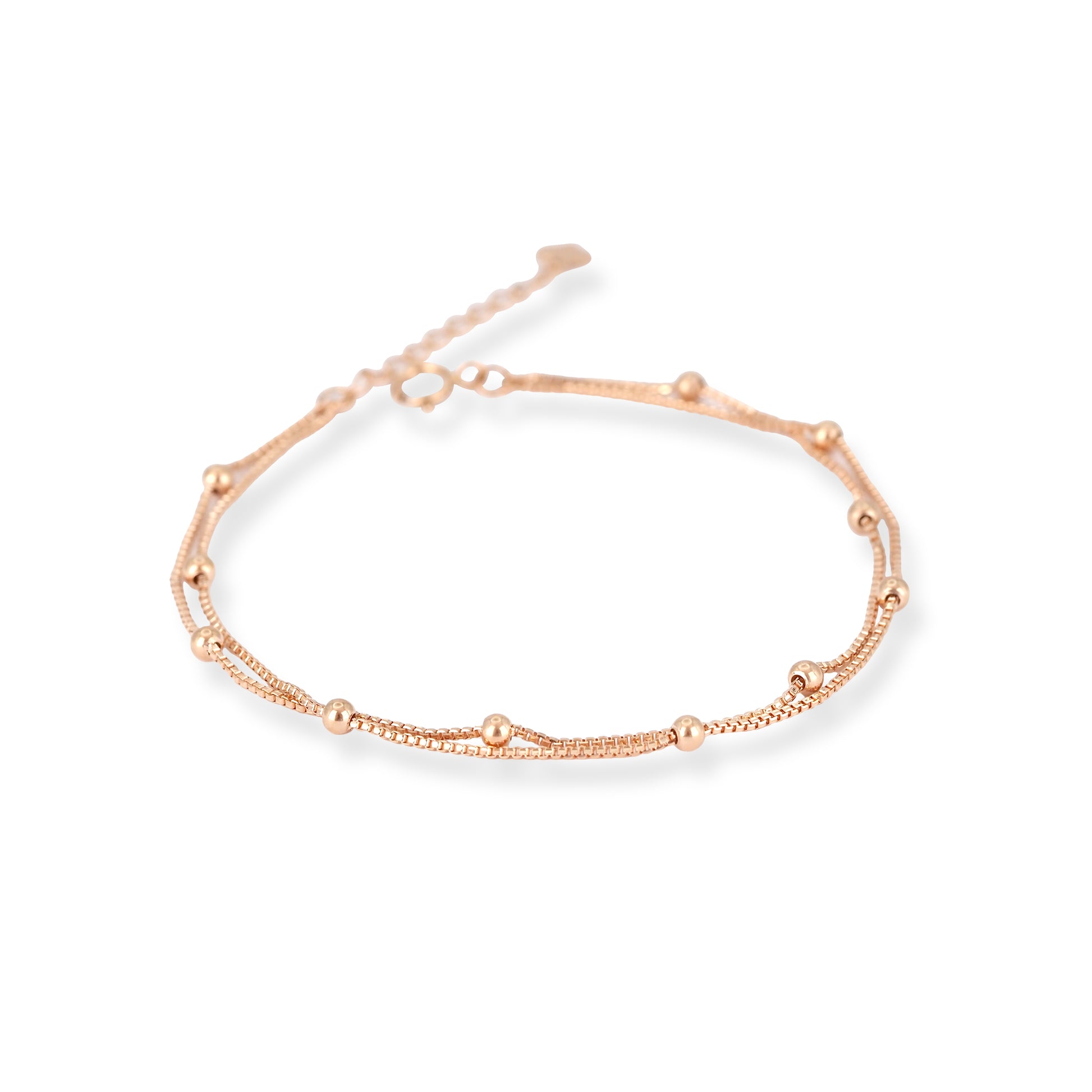 Delicate and refined, this 18ct Rose Gold Double Chain Bracelet with Polished Beads is designed for effortless everyday elegance. Crafted in warm 18ct rose gold, the bracelet features a graceful double-chain design accented with evenly spaced polished beads for a subtle yet eye-catching finish.