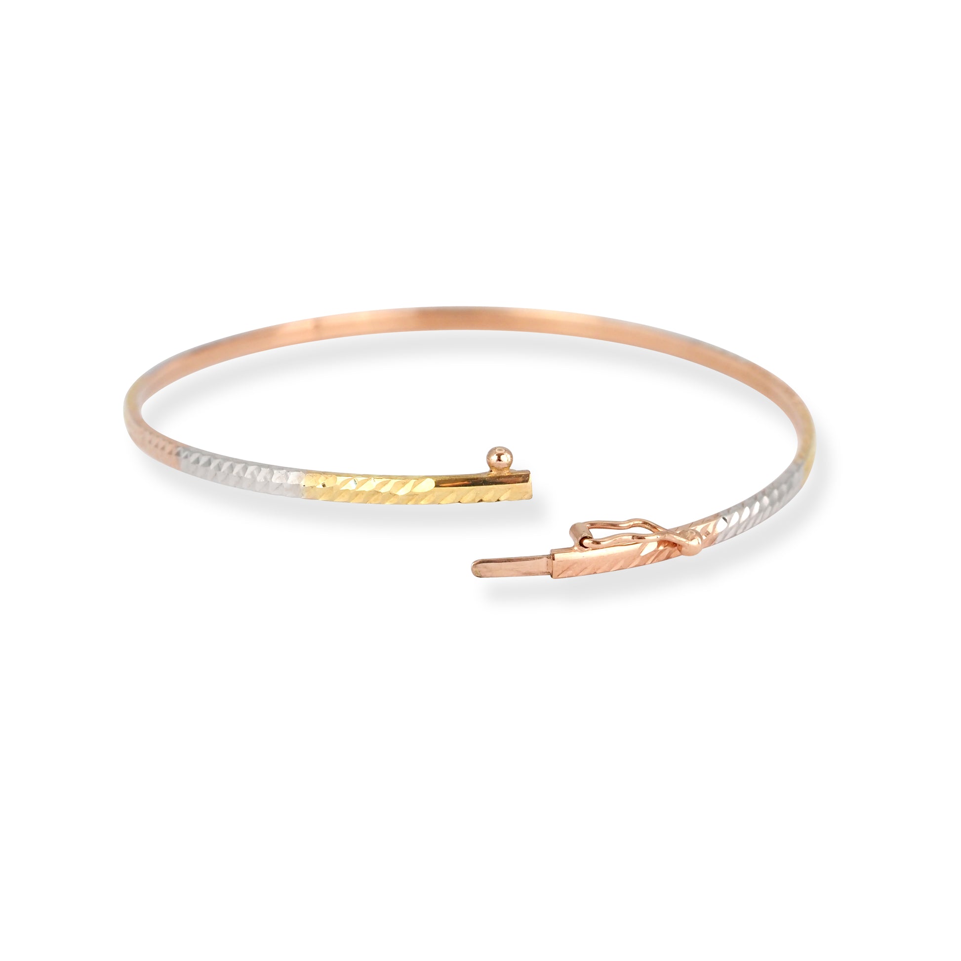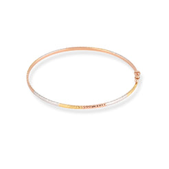 Elegant and refined, this 18ct Rose Gold Openable Bangle with Gold & Rhodium Detailing is a timeless piece designed for effortless everyday sophistication. Crafted in warm 18ct rose gold, the slim profile is enhanced with contrasting yellow gold and rhodium-plated accents, creating a subtle tri-tone finish that catches the light beautifully.