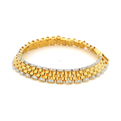 This 22ct gold men’s link bracelet is designed to deliver a bold look with comfortable wear. Featuring detailed rhodium plating across the links, the bracelet showcases a striking two-tone finish that blends classic yellow gold with modern white accents.
