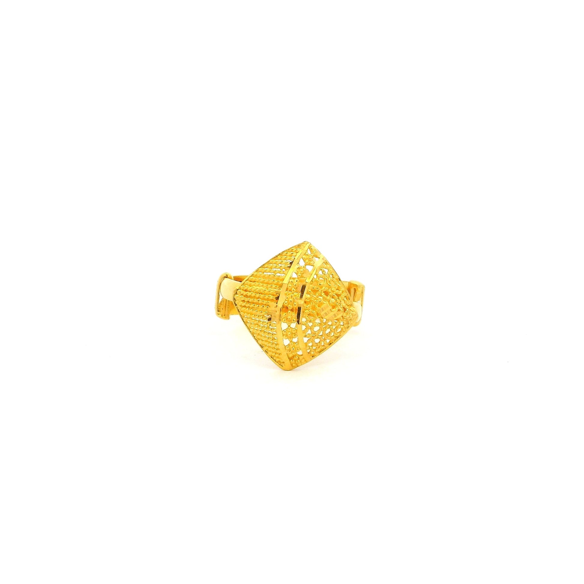 Crafted in rich 22ct yellow gold, this adjustable ring features an elegant jaali-inspired filigree design, showcasing fine detailing and traditional craftsmanship. The openwork pattern adds lightness and dimension, making it a standout statement piece that remains comfortable for everyday wear. With its adjustable band, this ring offers a flexible fit, making it ideal for gifting or adding a touch of classic elegance to any jewellery collection.