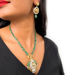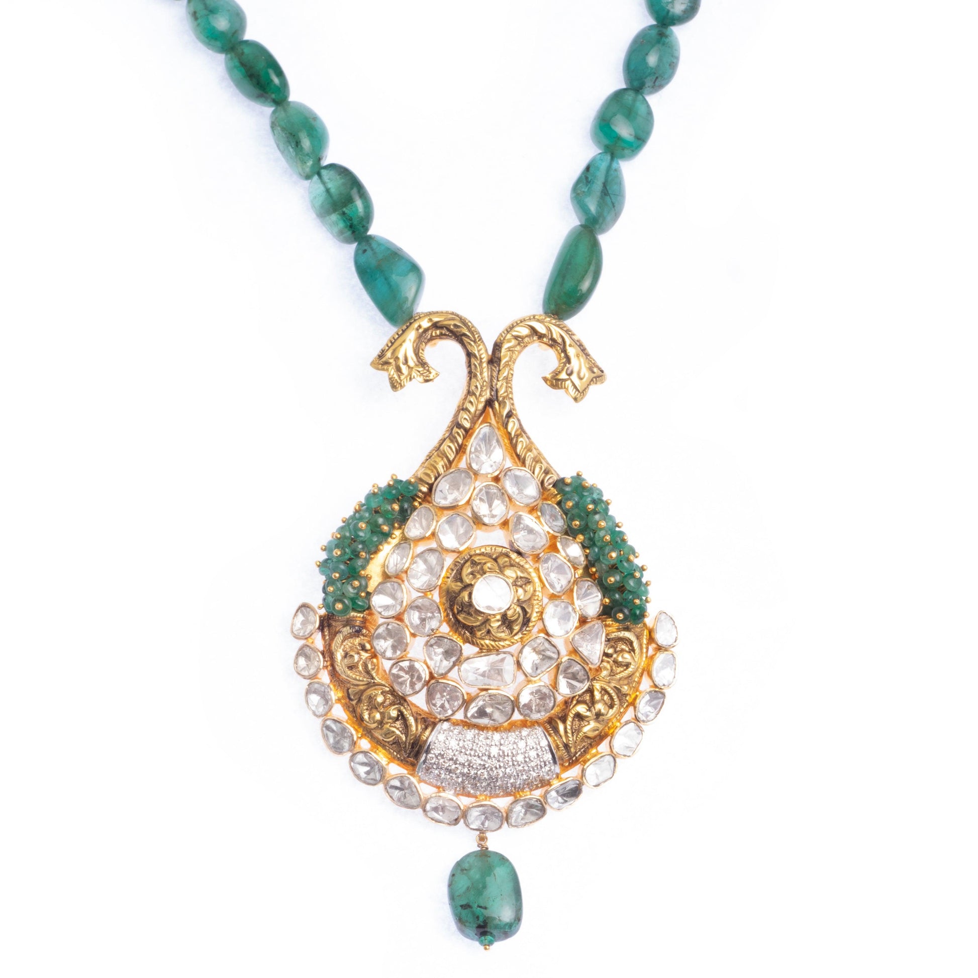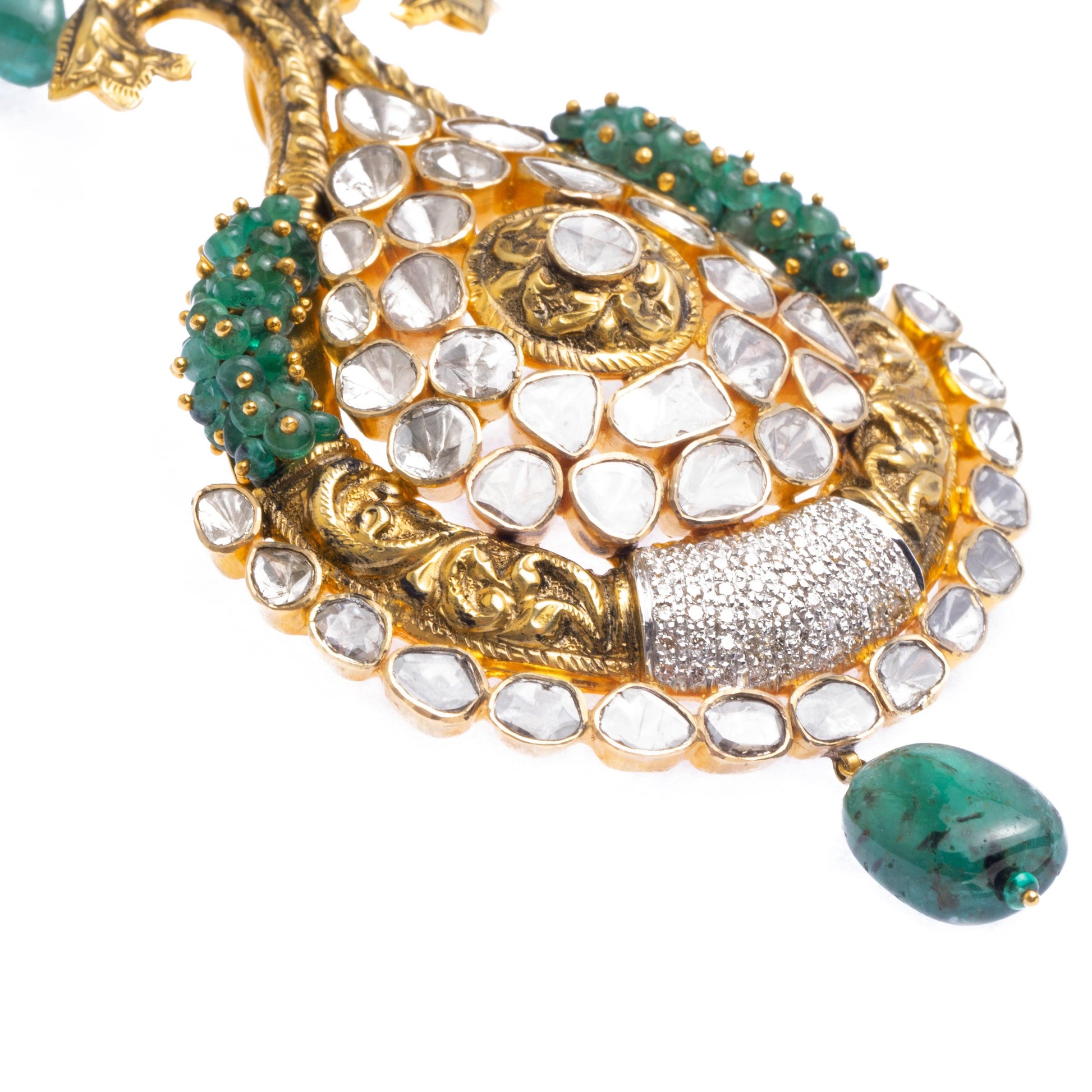 18ct Yellow Gold Polki Diamond and Emerald Necklace and Earrings Suite VPE-0818506 - Minar Jewellers