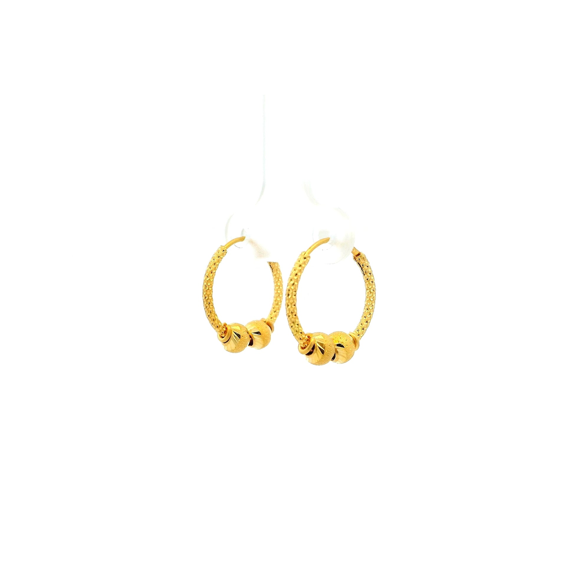 Crafted in rich 22ct yellow gold, these hoop earrings feature a textured filigree finish enhanced with decorative gold bead detailing for added depth and movement. The intricate surface texture catches the light beautifully, while the bead accents bring a subtle traditional touch. Perfect for both everyday wear and special occasions, they offer a refined and timeless look.