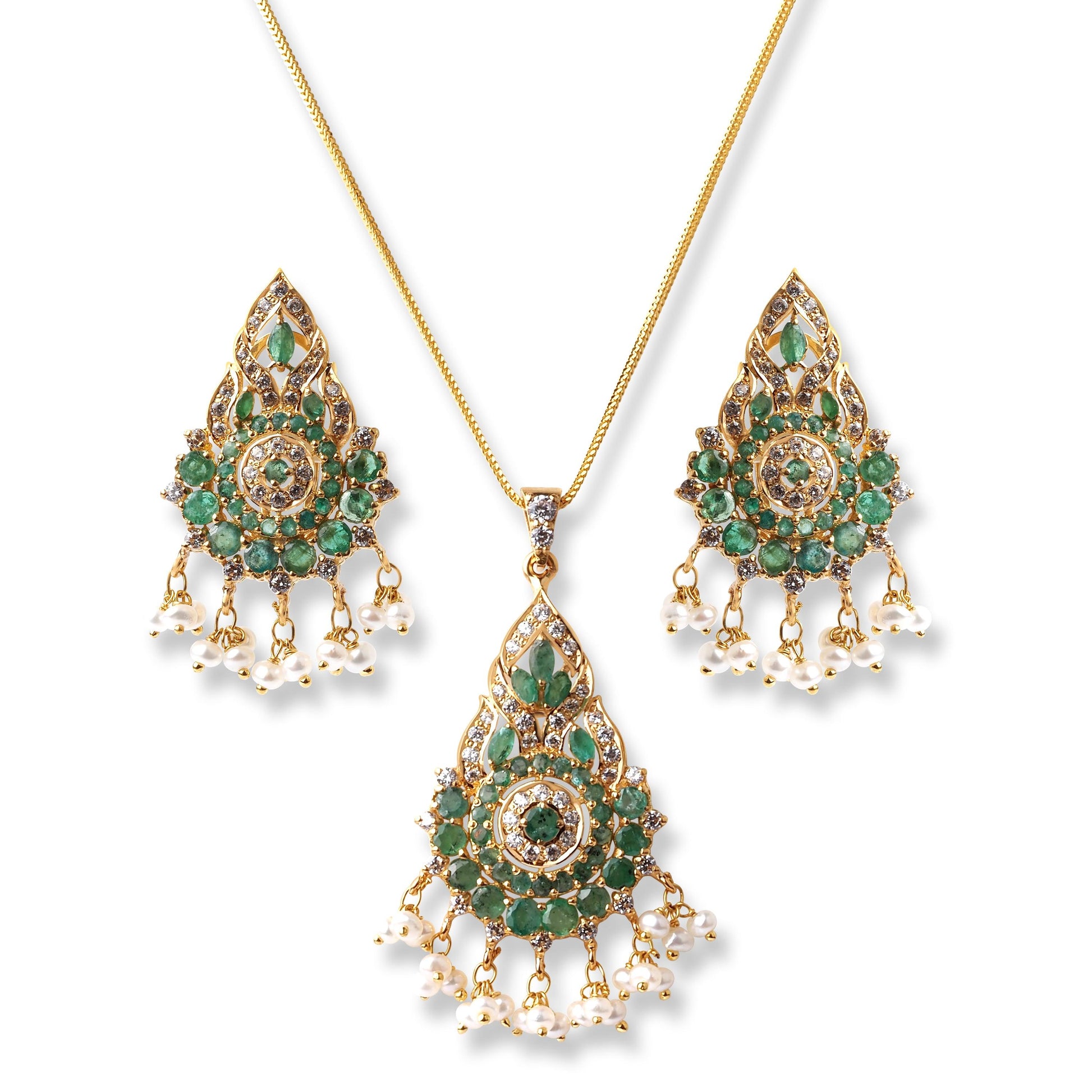 22ct Gold Set with Green Cubic Zirconia Stones & Cultured Pearls (Pendant + Chain + Earrings) (19.8g) - Minar Jewellers