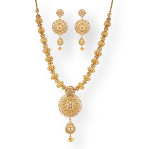 Crafted in 22ct gold with an antique-style finish, this necklace and earrings set features a striking floral circular pendant design. The intricate detailing reflects traditional artistry, while the bold motif adds a touch of regal elegance. A perfect ensemble for weddings, cultural events, or festive celebrations.