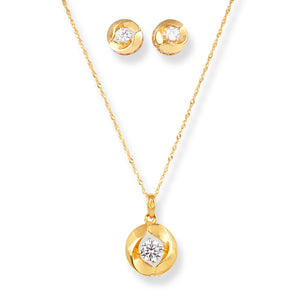This 22ct gold pendant and earrings set showcases a modern floral design, delicately accented with sparkling cubic zirconia stones. The graceful craftsmanship brings a fresh twist to a timeless motif, making it ideal for both everyday elegance and special occasions. A perfect blend of tradition and contemporary style.