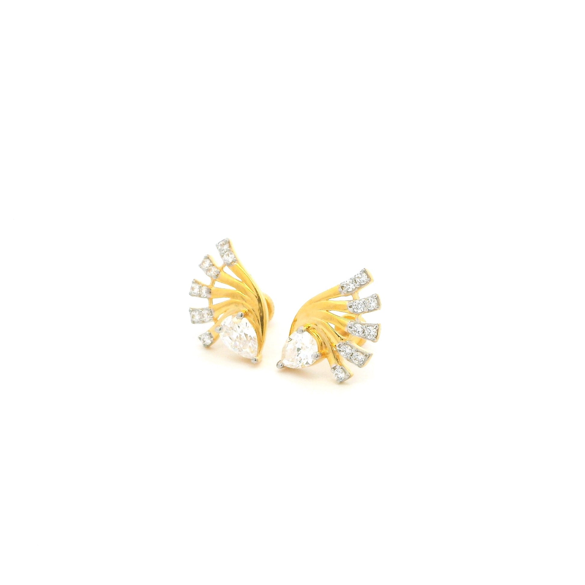Beautifully crafted in 22ct yellow gold, these eye-catching stud earrings feature a striking fan-inspired design centred around a sparkling pear-shaped cubic zirconia stone. The graceful gold curves are enhanced with additional shimmering cubic zirconia set along the edges, creating a radiant and luxurious finish. Perfect for special occasions or adding a touch of elegance to everyday wear, these earrings combine classic glamour with contemporary style.
