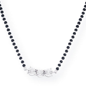 This 18ct white gold mangal sutra combines modern elegance with traditional symbolism, featuring sleek black beads complemented by sparkling diamond accents. The cool tone of white gold enhances the brilliance of the stones, making it a refined piece for daily wear and special occasions alike.