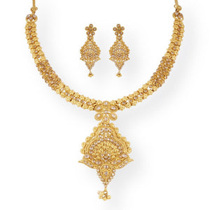 Rich in heritage and artistry, this 22ct gold bridal necklace and earrings set is crafted in an antique-style finish ...