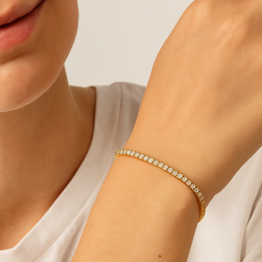 This stunning tennis bracelet features genuine 18-carat yellow gold craftsmanship that brings warmth and luxury to any occasion. The rich golden hue complements all skin tones and pairs beautifully with both formal evening wear and casual daytime outfits.