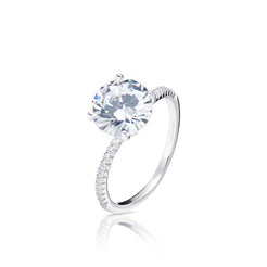 This stunning sterling silver ring features a brilliant round solitaire cubic zirconia stone, expertly set in a classic four-claw setting for maximum sparkle. The polished band is accented with pavé-set cubic zirconia, adding extra shimmer and sophistication to the design. Crafted in premium sterling silver and finished with rhodium plating, this ring offers a bright, tarnish-resistant shine. Perfect as an elegant everyday accessory, a gift, or as a stylish statement piece for special occasions.