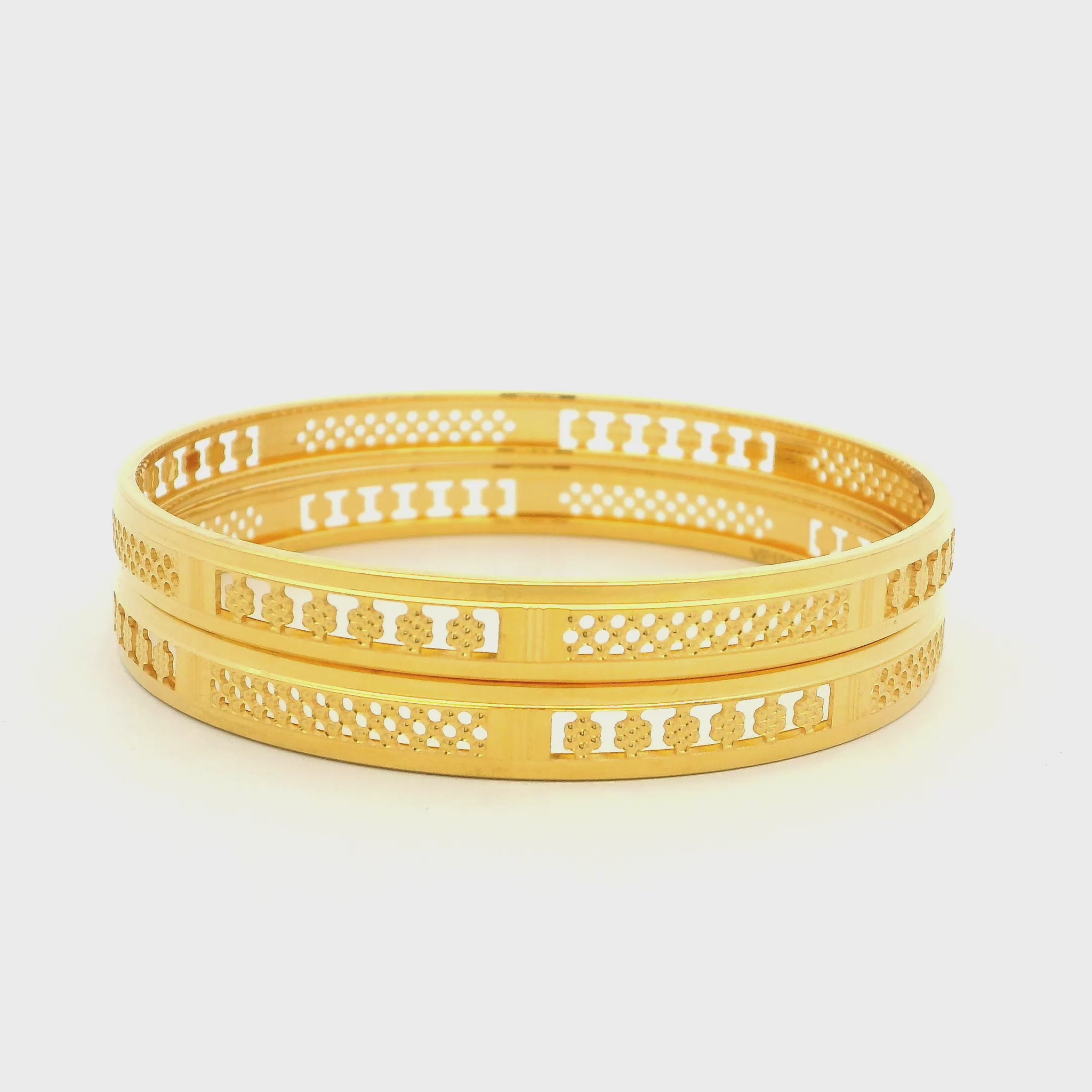 These 22ct yellow gold bangles feature a striking geometric cutwork design with alternating shapes and polished detailing. The intricate craftsmanship and lustrous finish make them a versatile accessory, perfect for weddings, festive wear, or as an elegant everyday statement.