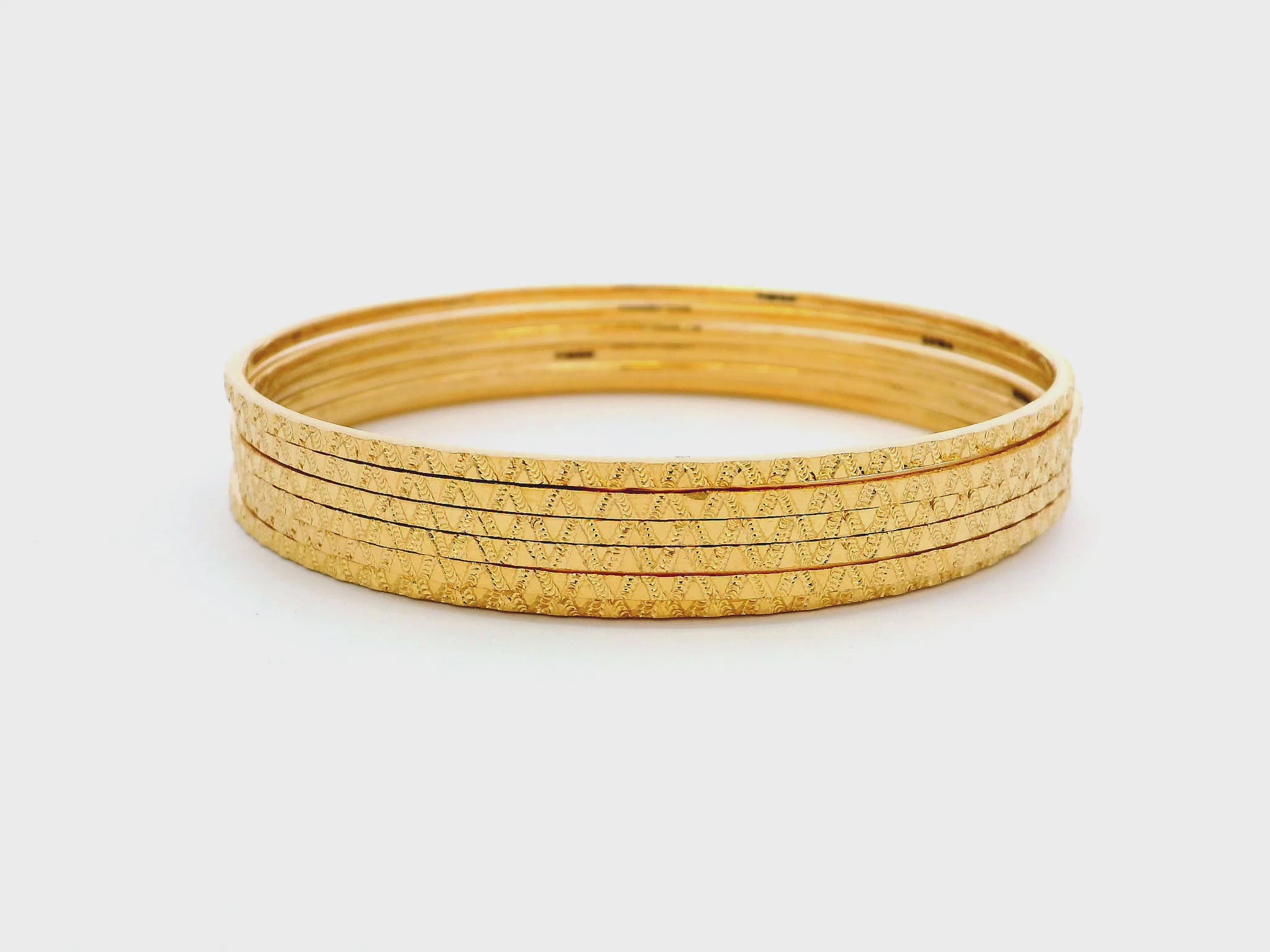 Versier je polsen met de tijdloze schoonheid van onze set van zes 22-karaats gouden bangles. Deze bangles, gemaakt v...