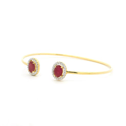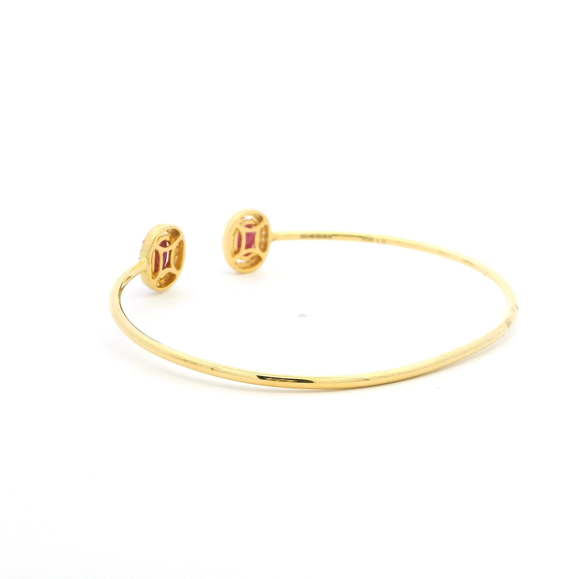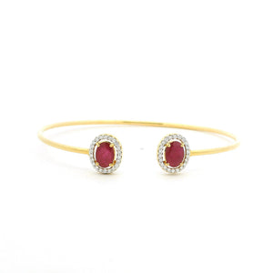 18ct Yellow Gold Ruby & Diamond Cuff Bangle – Minimal Open Design with Halo Ends