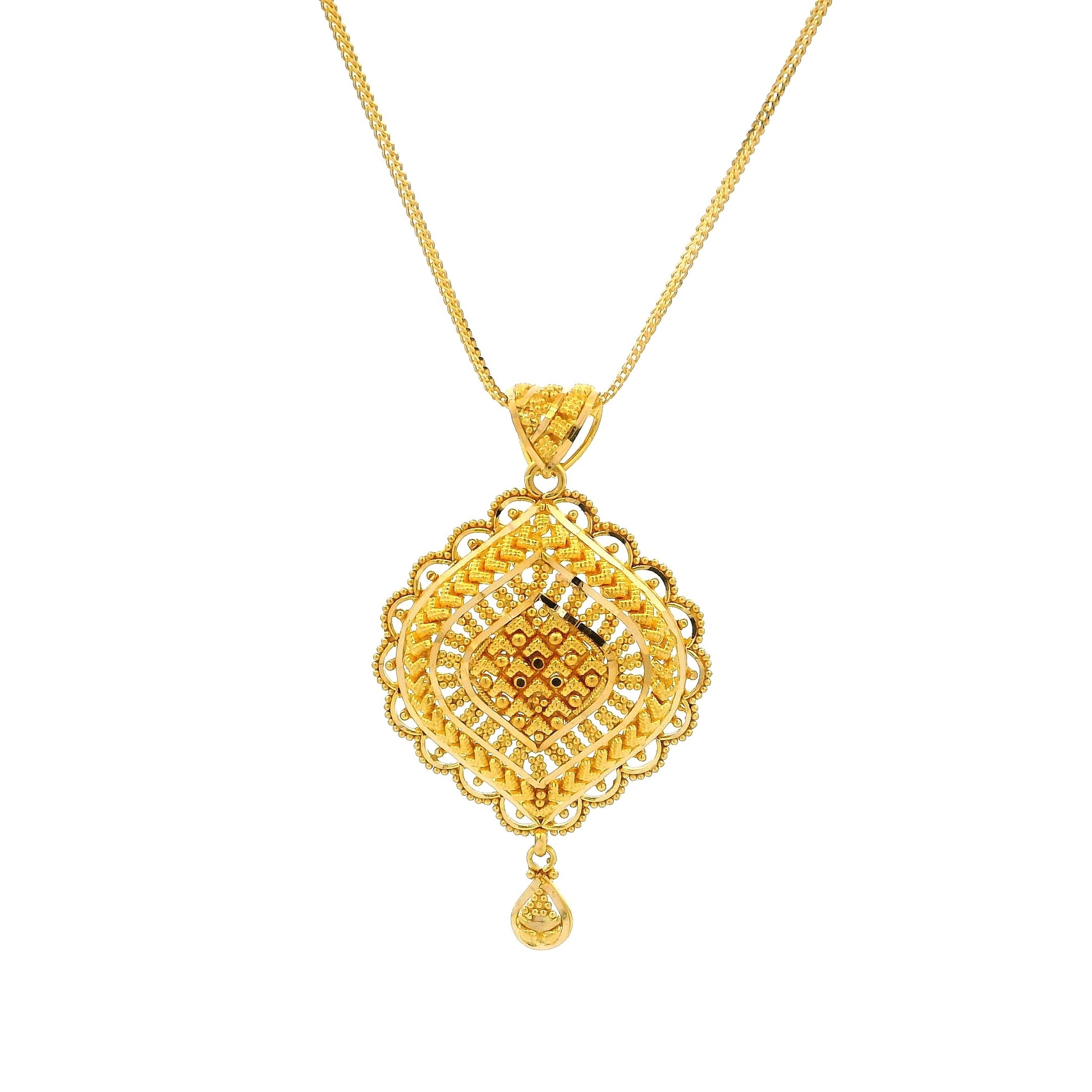 Crafted in rich 22ct gold, this elegant pendant set features a beautifully detailed rhombus-shaped pendant with intri...