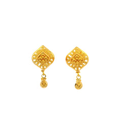 Crafted in rich 22ct gold, this elegant pendant set features a beautifully detailed rhombus-shaped pendant with intricate filigree work and matching coordinated earrings. The delicate openwork design and drop accents create a timeless traditional look with refined elegance. Perfect for weddings, celebrations, or elevating special occasion styling.