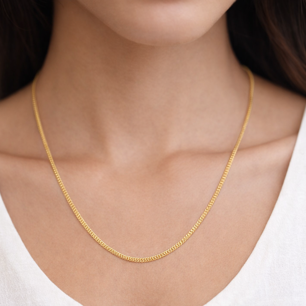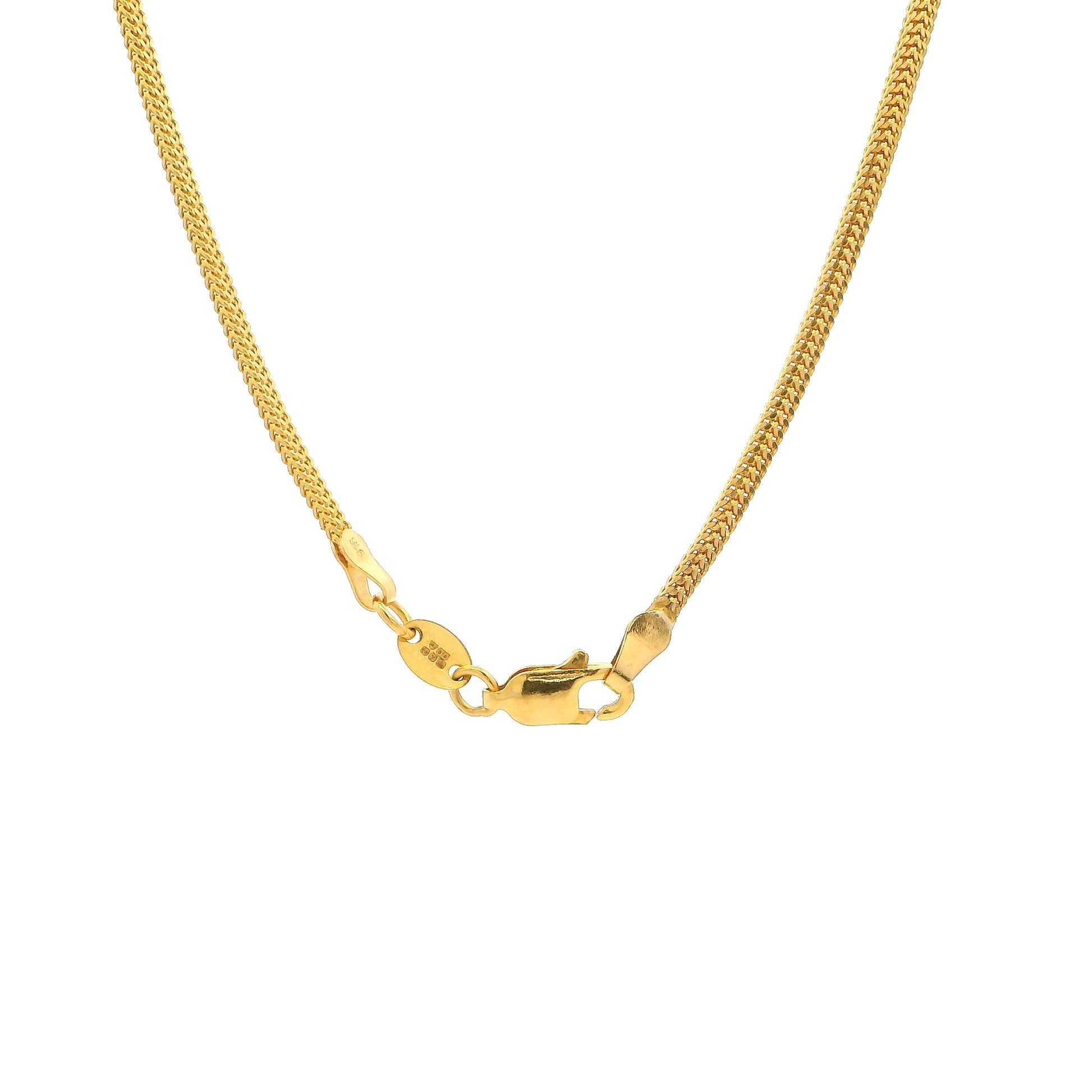 This 22ct Gold Flat Foxtail Chain Necklace showcases a sleek and classic design, crafted for those who appreciate refined simplicity. Featuring a flat foxtail link pattern, the chain offers a smooth, polished finish that sits comfortably against the skin while delivering a rich golden shine.