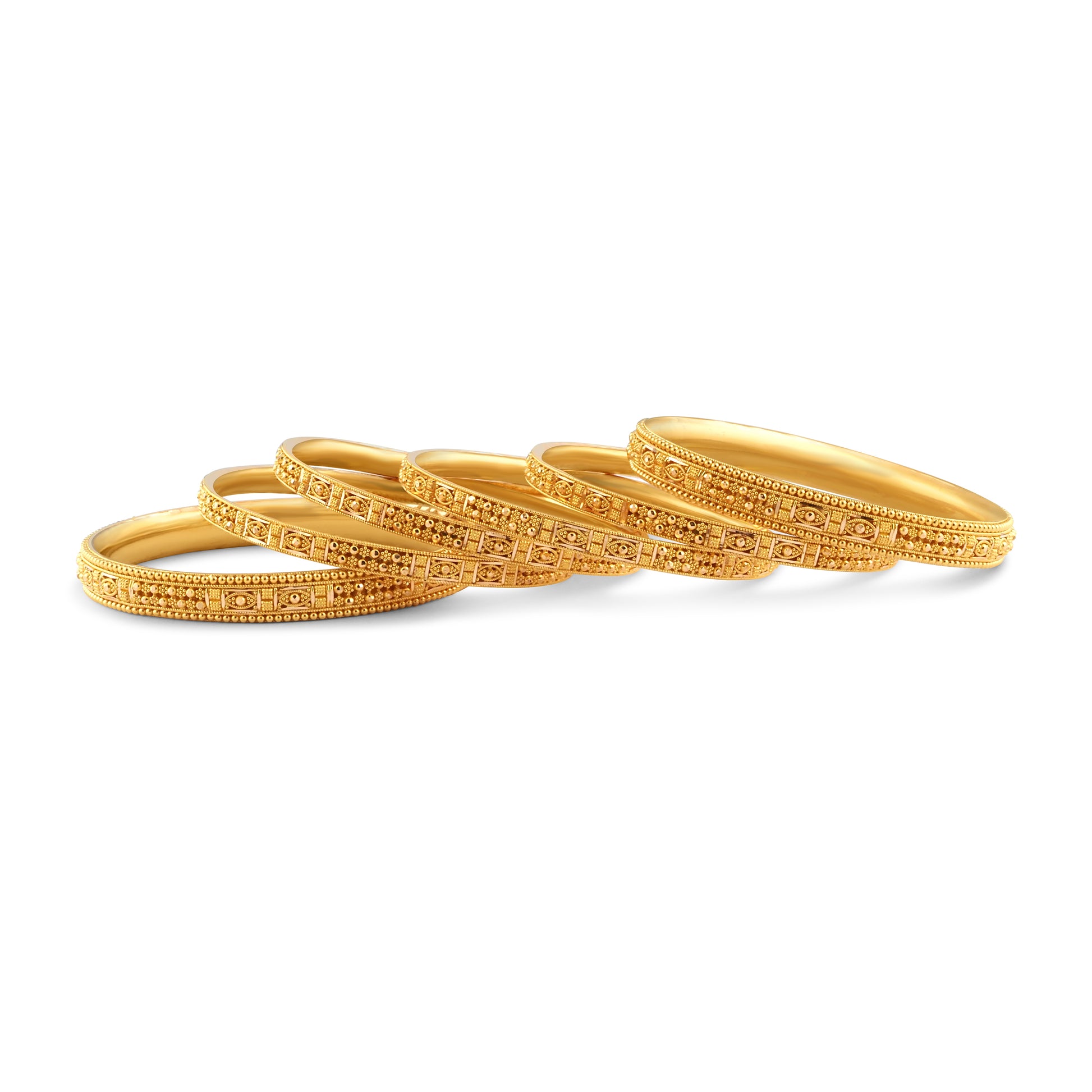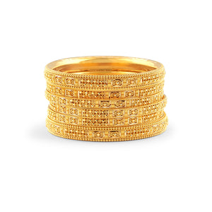 Designed for both style and comfort, the bangles feature a smooth inner surface for a comfortable fit, making them ideal for extended wear. Whether worn together as a statement stack or styled with other gold jewellery, this bangle set adds a touch of traditional elegance to any occasion.
