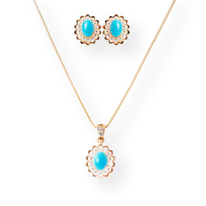 This luxurious 22ct gold pendant and earrings suite showcases an intricate floral design accented with vibrant turquoise and sparkling cubic zirconia. The bold combination of colour and brilliance enhances the richness of gold, creating a striking set perfect for weddings, festive occasions, or statement styling.